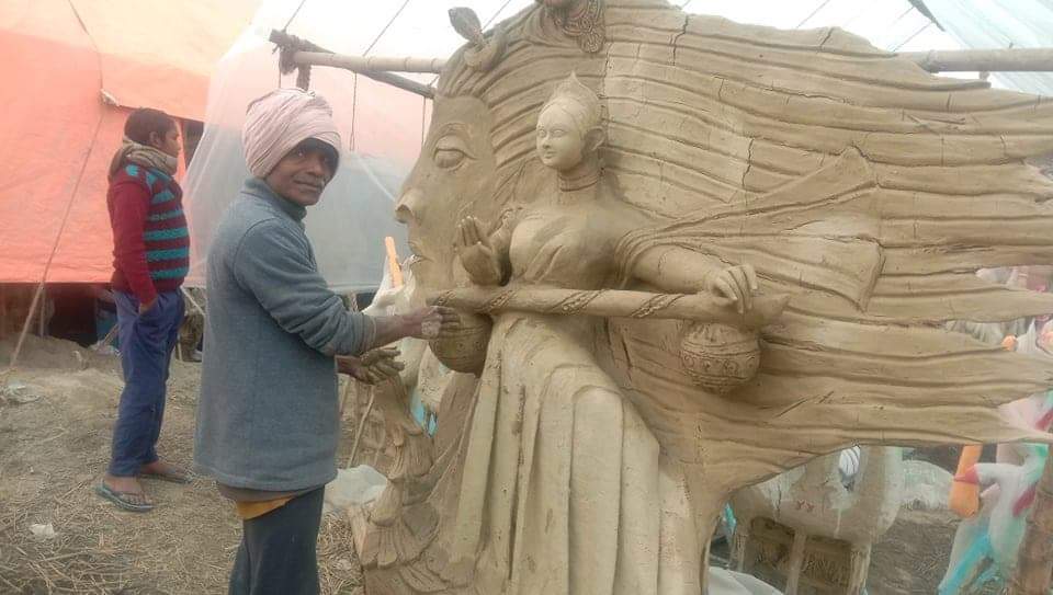 सरस्वती माता के मुर्ति बनावे मे मुर्तिकार व्यस्त