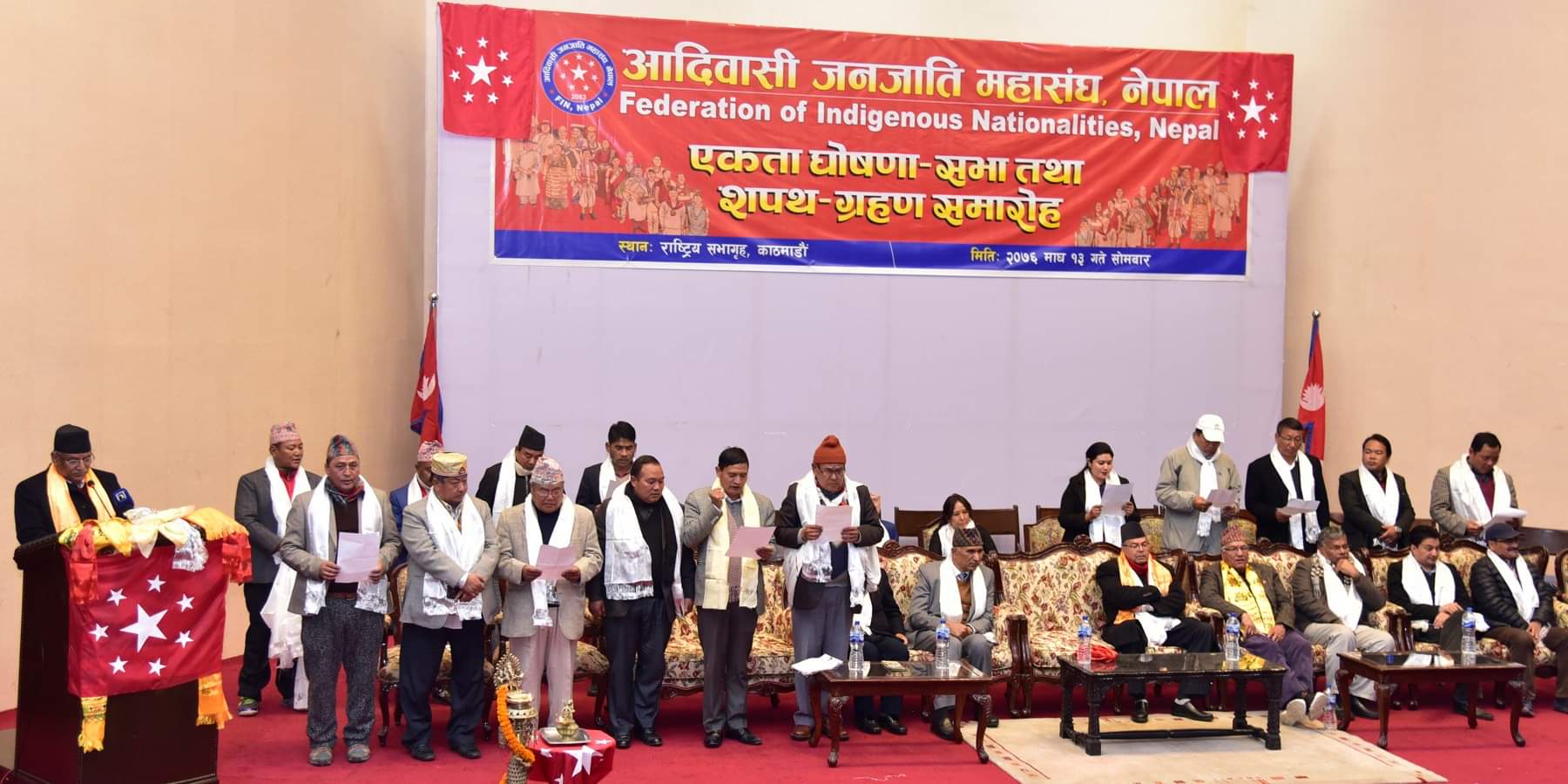 उ अवसर मे अध्यक्ष दाहाल नवगठित कार्यसमिति के शपथ खियवले रहनी । तत्कालीन नेकपा (एमाले) के नेपाल लोकतान्त्रिक आदिवासी जनजाति महासङ्घ आ नेकपा (माओवादी केन्द्र) आदिवासी जनजाति राष्ट्रिय महासङ्घ बीच एकता होके २६१ सदस्यीय आदिवासी जनजाति महासङ्घ नेपाल बनल बा ।