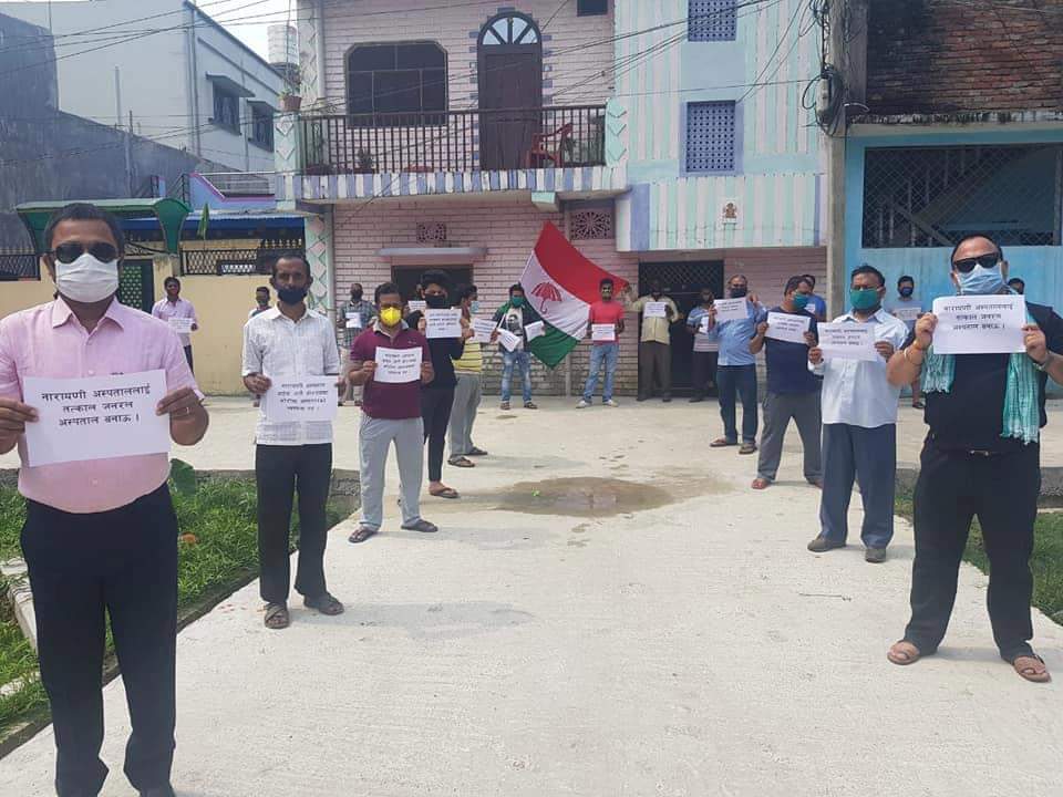 नारायणी अस्पताल के जनरल अस्पताल कायम करेके माग करत वीरगंज मे प्रदर्शन कईल बा । तत्कालिन राजपा नेपाल वीरगंज महानगर कमिटि के आयोजना मे सामाजिक दुरी कायम करत प्रदर्शन कईल बा । कोभिड १९ अस्पताल दोसर जगहा बनावे के माग उलोग के बा ।