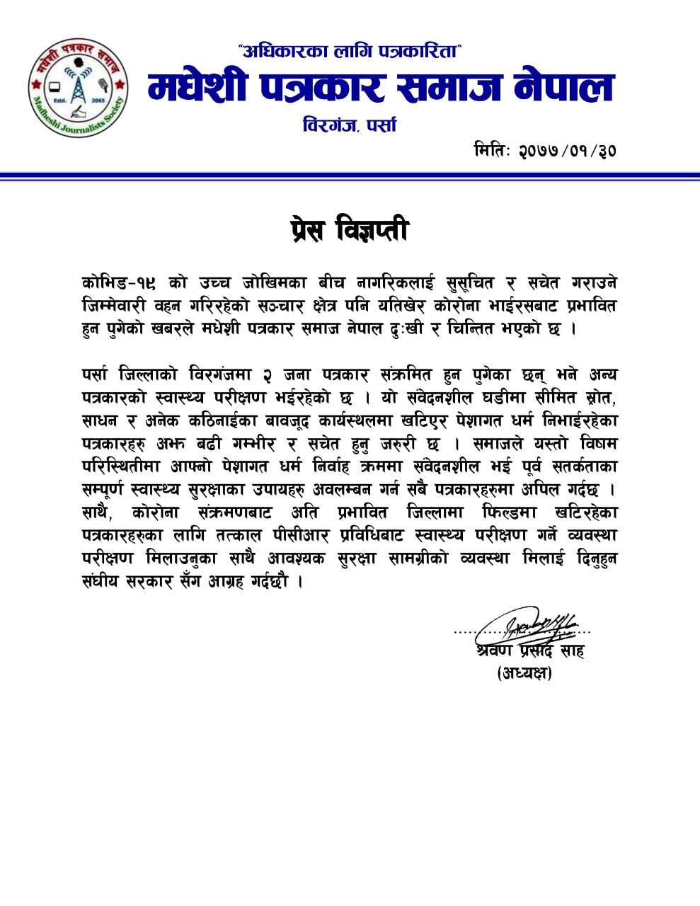 मधेसी पत्रकार समाज पर्सा के अध्यक्ष श्रवण प्रसाद साह आजु एगो विज्ञप्ति जारी करत कोभिड–१९ के उच्च जोखिम के बीच नागरिक के सुसूचित आ सचेत करावे के जिम्मेवारी वहन कररहल सञ्चार क्षेत्र भी ई समय कोरोना भाईरस से प्रभावित भईल खबर मिलला क बाद मधेशी पत्रकार समाज नेपाल वीरगंज पर्सा शाखा दुःखी आ चिन्तित भईल विज्ञप्ति मे जनावल गईल बा ।