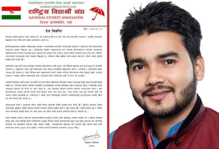 राष्ट्रिय विद्यार्थी संघ पर्सा आजु एगो प्रेस विज्ञप्ति जारी करत वीरगंज मे कोरोना सङ्क्रमण रोकथाम तथा नियन्त्रण आ सङ्क्रमितलोग के ईलाज मे रहललोग के व्यस्थापन मे चुकल आरोप लगावत आपत्ति जनवले बा ।