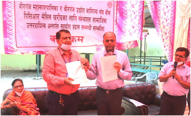 वीरगंज के उद्योगी व्यवसायीलोग कोरोना भाइरस के चेकजँच करेवाला पीसीआर मेसिन किने खातिर वीरगंज महानगर पालिका के ७० लाख रोपेया सहजोग कईले बाडन ।