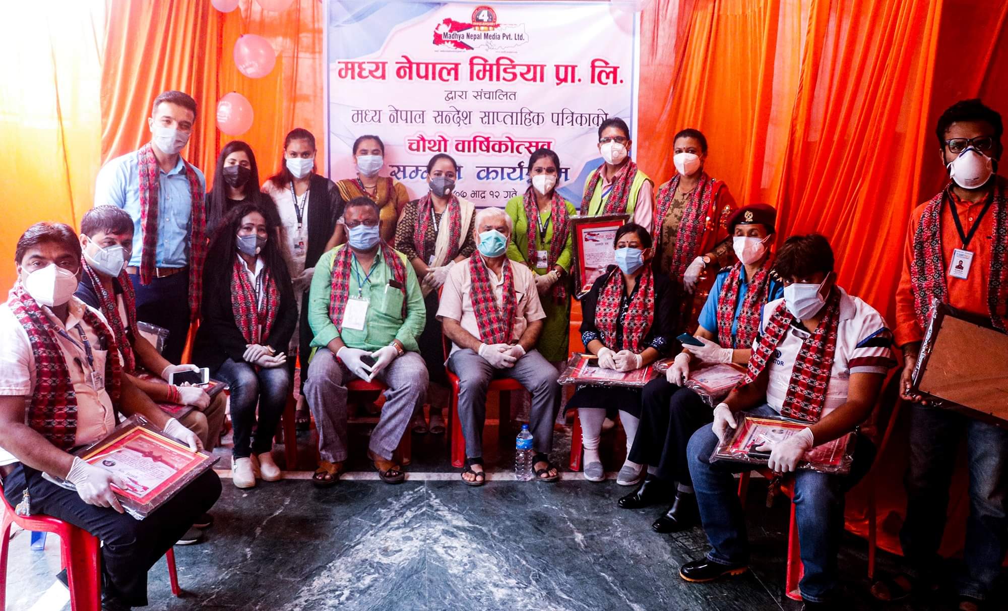 मध्य नेपाल सन्देश के सम्पादक कविता खड्का के सभापतित्व मे भईल कार्जक्रम मे कोरोना महामारी मे अनेकन क्षेत्र से योगदान पुगावल आदमीसब के सम्मान कईल बा ।
