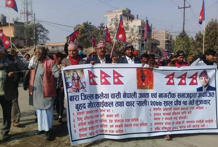 २०७२ साल के संविधान जनता के संरक्षण करे ना सकल खारिज करे के, २०४६ साल मे बनल संविधान लागू करे के, नेपाल मे राजतन्त्र सहित के प्रजातन्त्र लियावे के माग करत मोटरसाईकल जुलुस कईल गईल रहे जेकर अगुवाई बृजकिशोर साह कईले रहनी ।