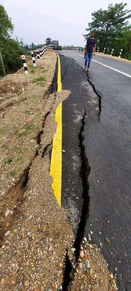 पुल लगे के एक ओरी के भाग चिरा पर के टुटे लागल स्थानीय नातिकाजी सुनार जानकारी देहनी । ‘हुलाकी निर्माण पूरा भईल कहके हस्तान्तरण भईला दु महिना बितल बा, माकिर रोड फाट के फुटे लागल बा,’ कहत उ, ‘माटी बढिया से दाब के पिच करेके चाहिंत मात ओईसन नईखे भईल, पानी पडते मातर रोड फाटल बा । रास्ता हि अवरुद्ध होखेके स्थिति बा ।