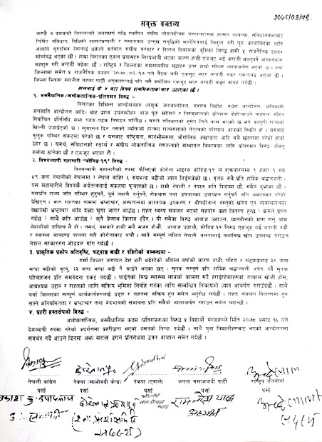 इकरा से देश गम्भिर संकट मे पडल बा आ एकरा से राष्ट्रियता, सार्वभौमसत्ता, भौगोलिक अखण्डता अदि सभी खतरा मे पडल हमनी के ठहर बा । यसर्थ, संविधान के रक्षार्थ आ संघिय लोकतान्त्रिक गणतन्त्र के संस्थागत विकास के खातिर प्रतिगमन विरुद्ध खडा भईल कत्र्तव्य मनले बानी आ एकजुट भईल बानी उल्लेख कईल बा । विश्वव्यापी माहामरी के रुप मे फईलल कोरोना भाईरस (कोभिड –१९) शुक तक ९ हजार १ सय ८९ जने नेपाली के नेपाल मे आ नेपाल बाहर ५ सय से बेसी के ज्यान लेहले बा । मृतक सभी उपर हार्दिक श्रद्धाञ्जली ।