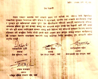 प्रेस युनियन पर्सा, प्रेस सेन्टर पर्सा, समाजवादी प्रेस संगठन नेपाल पर्सा आ राष्ट्रिय दलित पत्रकार संघ पर्सा आजु संयुक्त रुप मे प्रेस विज्ञप्ती जारी करत माघ १ गते शनिचर के दिने होखेवाला पुरस्कार वितरण समारोह बहिस्कार करेके जनवले बाडन ।