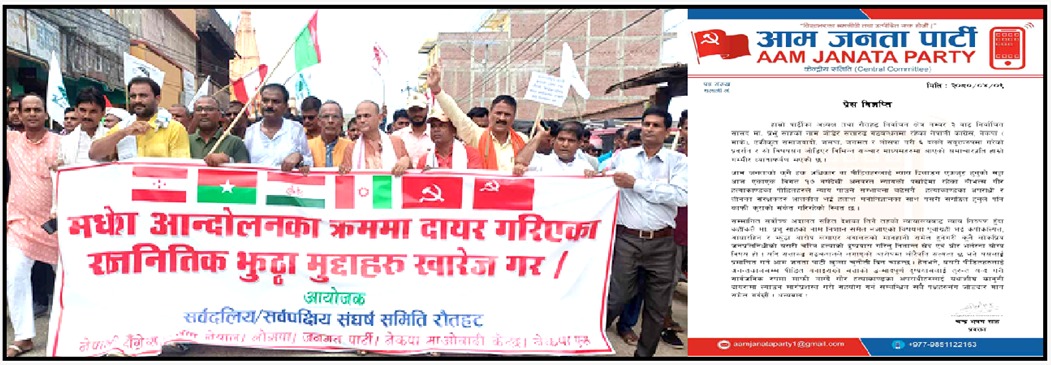 एहितरे गौर हत्याकाण्ड के हत्यारा के जोगावे खातिर रौतहट के राजनीतिक दलसब एकजुट भईल बाडन । ती दल गौर प्रदर्शन करत गौर हत्याकाण्ड के हत्यारा के जोगावेमे प्रयास कईल आरोप आम जनता पार्टी (आजपा) लगवले बा ।