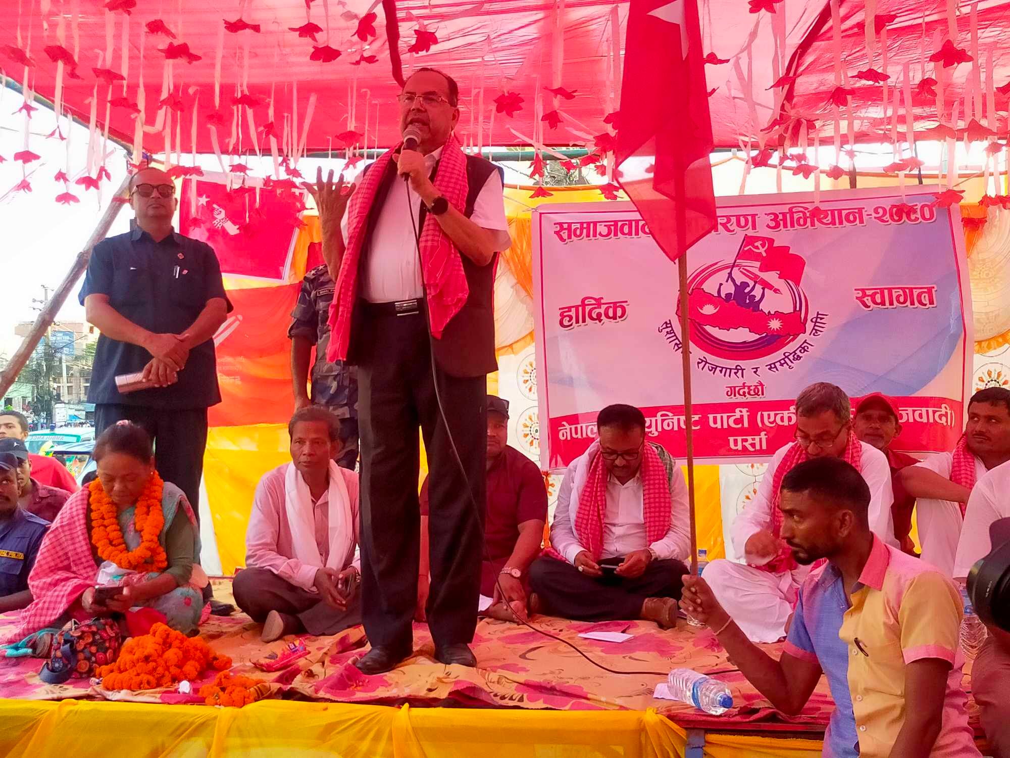 कार्जक्रम मे पार्टी के उपमहासचिव एवं मोर्चा संगठन के ईन्चार्ज बिजय पौडेल समाजवादी क्रान्ति के निति, कार्यदिशा, सिद्धान्त बारे जानकारी करावत जनता के जागृत करावे खातिर जागरण अभियान २०८० सुरु कईल बतवनी । उ समाजवाद के लक्ष्य बनाके हमनी ई समय करेवाला कामसब काथि बा, हमनी सचेत होके जागरण अभियान ओरी अगाडि बढत जनता के अपार सहानुभुति लिया रहल बतवनी । आजु हमनी के देश मे बेरोजगारी बहुते बा, हमनी के युवालोग खाडी जाएमे बाध्य बाडन उलोग के कईसे रोकेके पडि, ई सारा समस्यासब के समाधान एके बा उ देश के औधोगिकरण करेके परल, उद्योग खोलेके परल, हमनी के कृषि आधुनिकरण करेके परल, जब तक उद्योग ना खोलल जाई, जब तक कृषि के आधुनिकरण करे ना सकल जाई तब तक हमनी के अवस्था बदले ना सकेके दाबी कईनी ।
