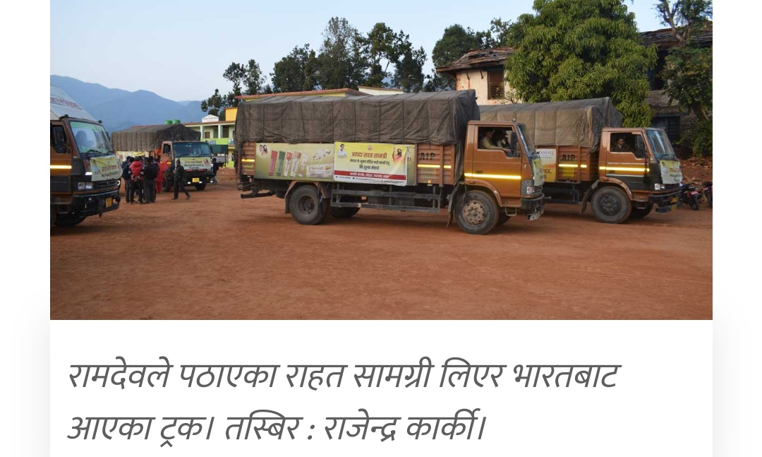 ती सबै ट्रक सात स्थानीय पालिकामा पुगेर सोमबार वितरण हुनेछन्। स्वामी रामदेव जी महाराज र आचार्य बालकृष्ण जी को तस्वीर अंकित राहत सामग्री बोकेका ट्रकमा ‘आपदा राहत सामग्री, नेपाल के भूकंप पीडित भाइ-बहनों हेतु निः शुल्क सेवार्थ’ भनेर लेखिएको छ। उक्त राहत सामग्री लिएर पतञ्जली योग समिति नेपालका अध्यक्ष लबदेव जी आएका छन्।