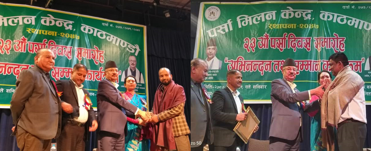 पर्साका दुई सञ्चारकर्मी शनिवार काठमाडौंमा सम्मानित भएका छन् । पर्सा मिलन केन्द्र काठमाडौंले आफ्नो २३ औं स्थापना दिवसको आयोजित एक कार्यक्रमका बिच मनाएको छ । पर्सा जिल्लाबाट काठमाडौंमा गएर बस्ने बुद्धिजीवी, व्यवसायी, कर्मचारी, बिद्यार्थी लगायत बिचको सम्बन्धलाई प्रगाढ बनाउने उदेश्यले केन्द्रले स्थापनाकाल देखि नै कार्यक्रमलाई निरन्तरता दिदै आएको आयोजकले जनाएको छ ।
