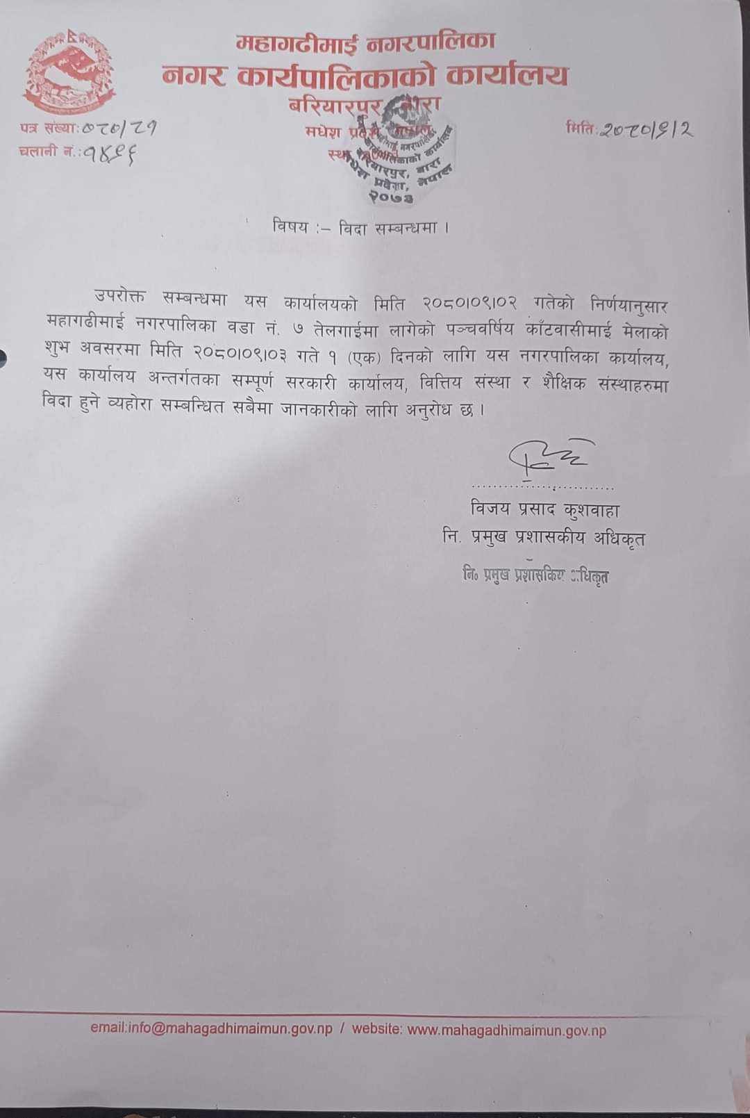 बारा के महागढीमाई नगरपालिका कटवासीमाई के मेला देखेला स्थानिय तह मे रहल सभे कार्यालय के पुस ३ गते छुटी देहले बा ।