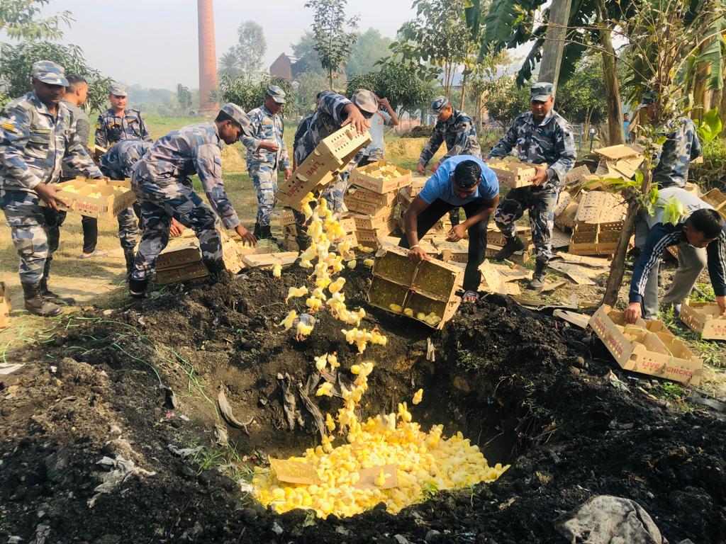 नियन्त्रणमा लिएको चल्लालाई न १३ गणको चौरमा खाल्टो खनि पशु क्वारेन्टाइनको डा हरेराम यादब ` ह्ययाचारी संगको देबेन्द्र सिंह वडा अध्यक्ष हिरा गिरी नेपाल प्रहरी पत्रकारहरुको रोहबरमा नस्ट गरि पक्राउ परेका फार्म संचालक गुप्ता लाइ आवश्यक कारवाहीको लागि भन्सार कार्यालय बिरगंज पठाइकोछ ।