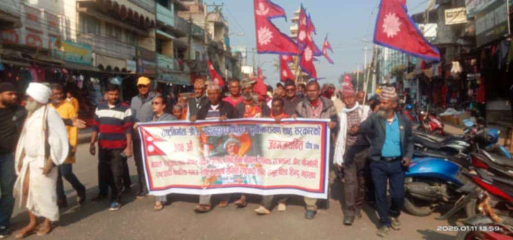 वीरगंज । नेपाल राष्ट्रबाद सघं, नेपाल बिद्धत परिषद्, शिव सेना नेपाल, देश भक्त राजभक्त समुह, बीर गोरखाली, राष्ट्रबादी नागरिक समाज, राष्ट्रिय संघर्ष समिती, राष्ट्रबादी शान्ती समुह, बिश्व हिन्दु महासंघ के संयुक्त आयोजना मे राष्ट्रनिर्माता पृथ्वीनारायण शाह के ३०४ वाँ जन्मजयन्ती एंव राष्ट्रिय एकता दिवस के अवसर मे वीरगंज मे जुलुस निकलले बा ।