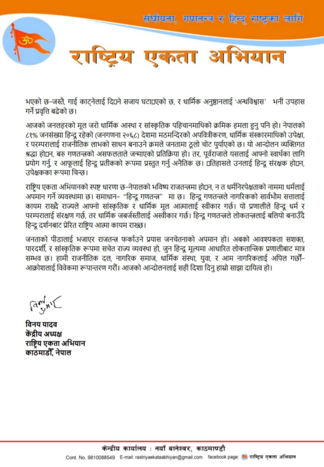 यसको समाधानको रूपमा राष्ट्रिय एकता अभियानले ‘हिन्दू गणतन्त्र’ को अवधारणा प्रस्तुत गरेको छ—जसमा लोकतन्त्र कायम रहनेछ, तर राज्यले हिन्दू सांस्कृतिक आत्मालाई अंगिकार गर्नेछ। अभियान अध्यक्ष विनय यादवद्वारा हस्ताक्षरित विज्ञप्तिमा हिन्दू गणतन्त्रले धार्मिक जबर्जस्तीलाई अस्वीकार गर्दै सहिष्णुता, पारदर्शिता र सांस्कृतिक चेतनायुक्त राज्य प्रणालीको निर्माणमा बल दिने दाबी गरिएको छ।