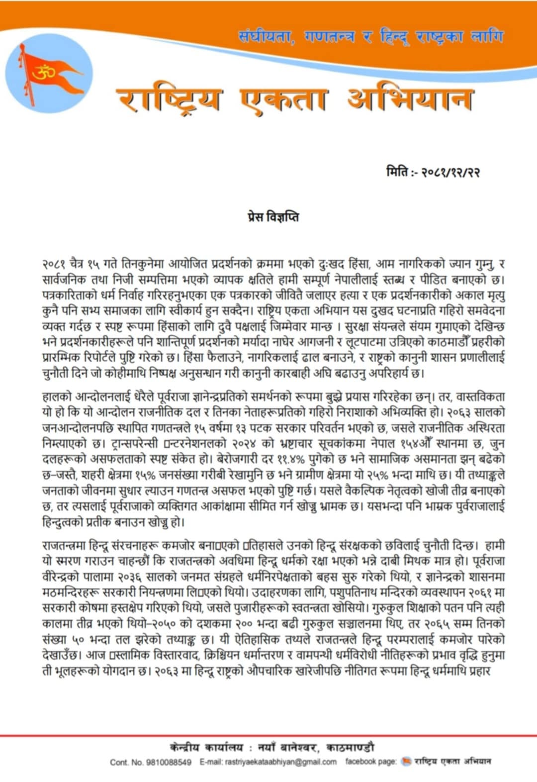 राष्ट्रिय एकता अभियानले पूर्वराजाको हिन्दुत्वसँग जोडिएको छविप्रति पनि कडा टिप्पणी गरेको छ। विज्ञप्तिमा राजतन्त्रकालमा हिन्दू धर्मको संस्थागत क्षय भएको उल्लेख गर्दै पूर्वराजालाई हिन्दू संरक्षकको रूपमा चित्रण गर्नु ऐतिहासिक दृष्टिले गलत भएको बताइएको छ। पशुपतिनाथ मन्दिरको व्यवस्थापनदेखि गुरुकुल शिक्षाको पतनसम्मका उदाहरण प्रस्तुत गर्दै अभियानले पूर्वराजालाई ‘हिन्दू परम्पराको उपेक्षक’ को रूपमा चित्रित गरेको छ।