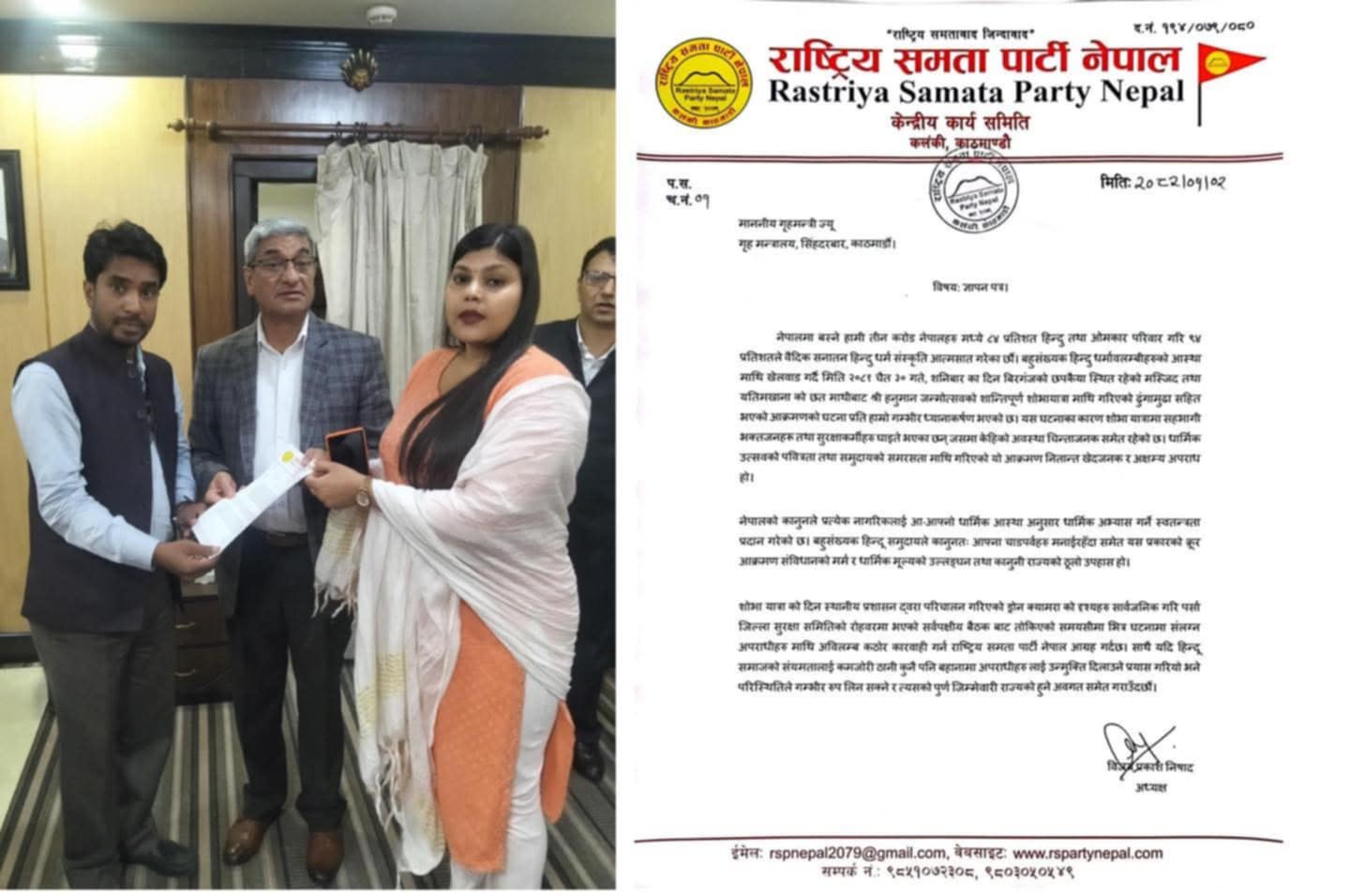 राष्ट्रिय समता पार्टी नेपालका केन्द्रीय अध्यक्ष विजय प्रकाश निषादको नेतृत्वमा एक प्रतिनिधिमण्डलले आज गृहमन्त्री लेखकलाई ज्ञापन पत्र बुझाउँदै शोभा यात्रामाथिको क्रूर आक्रमणको विरोध जनाएको छ।