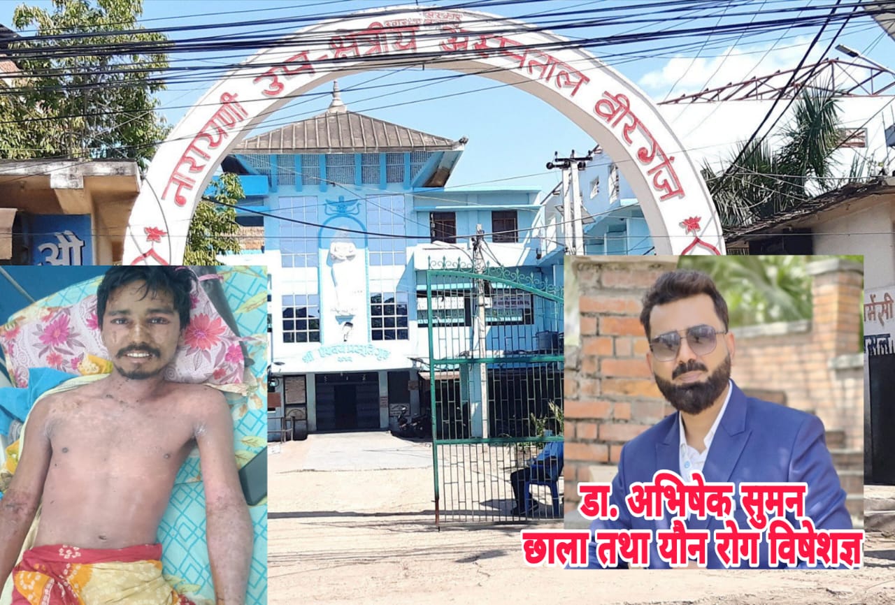 पर्सा जिल्लाको सखुवाप्रसौनी गाउँपालिका वडा नं. १ खजुरी टोलका २२ वर्षीय धर्मपाल भण्डारीको शरीरको झन्डै ८० प्रतिशत छालामा फोका जस्तो आएकोमा उनी साउन ८ गते आफ्ना दाई भाउजु सँगे नारायणी अस्पतालको ईमरजेन्सी वार्डमा उपचार गराउन आए ।