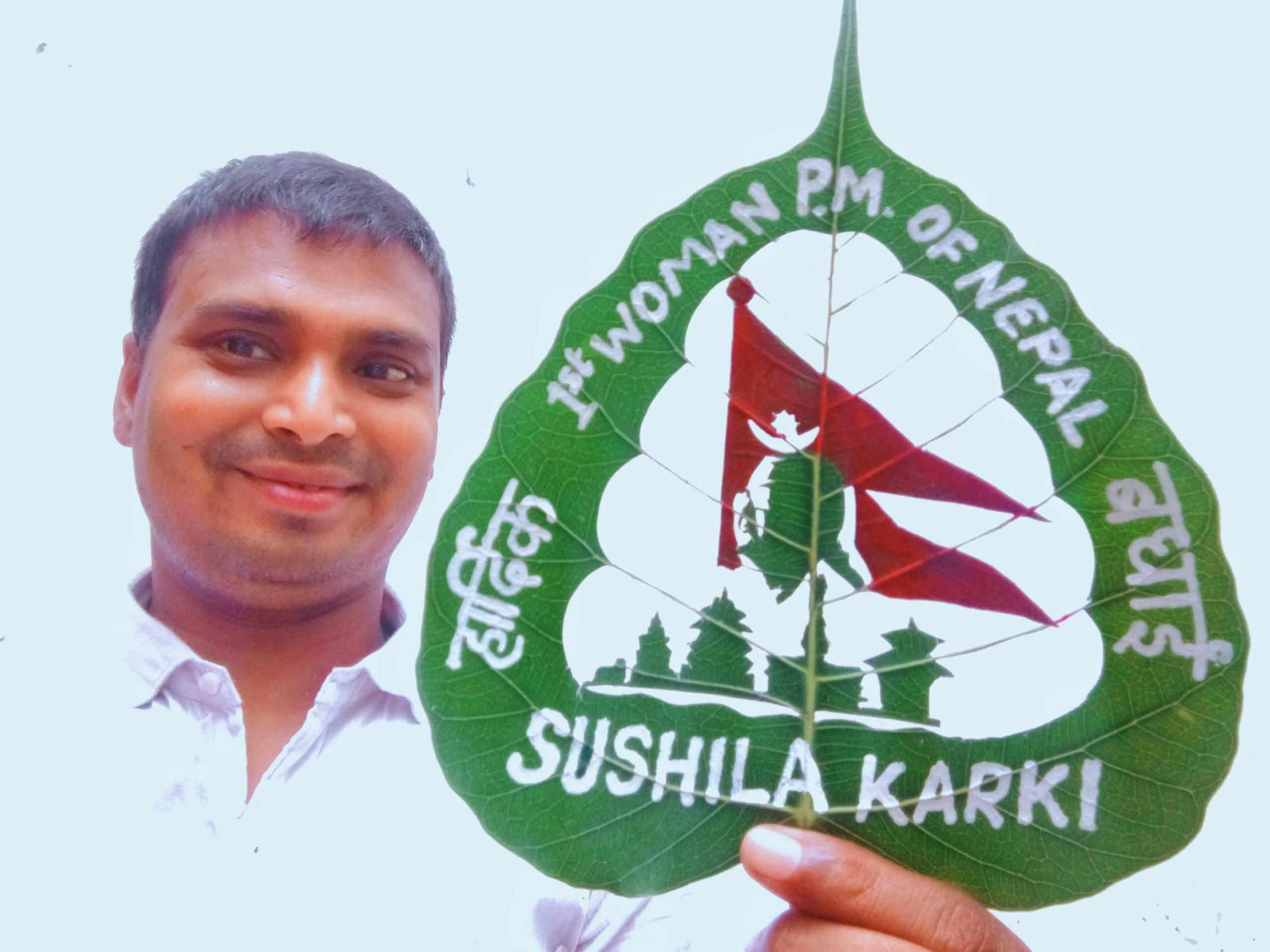 नेपाल के प्रधानमंत्री सुशीला कार्की के तसवीर बना के लीफ आर्टिस्ट मधुरेंद्र दीहलन अनोखा बधाई