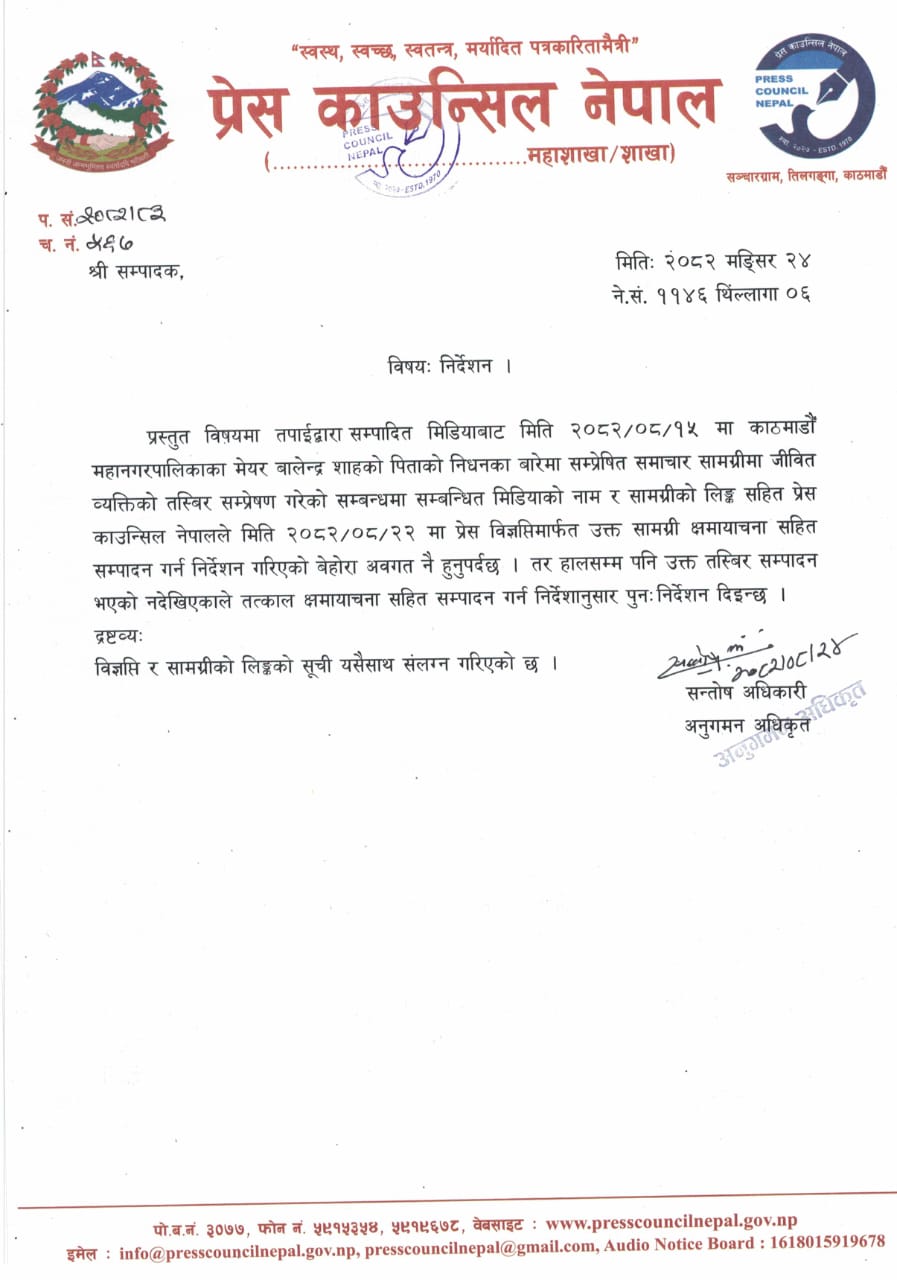 वीरगंज २७ अगहन । मिति २०८३ मंसिर २४ गते के दिन हमनी के सम्मानित संस्था प्रेस काउन्सि नेपाल के पत्र संख्या २०८२/८३ आ च.नं. ५६७ के निर्देशन पत्र ईमेल मार्फत मिलल बा ।