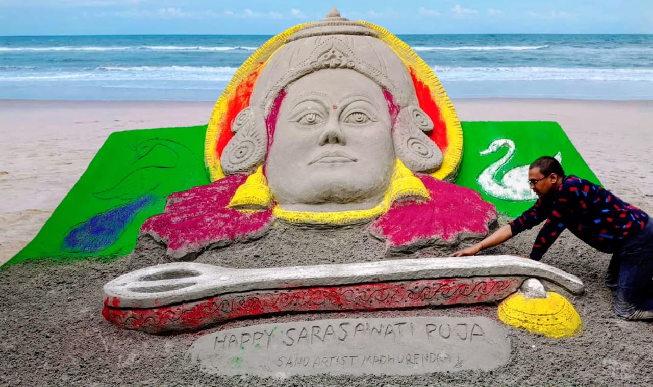 २० टन कोयला के राख से सैंड आर्टिस्ट मधुरेंद्र रचले मां सरस्वती के अद्भुत स्वरूप, कलाकृति बनल चर्चा के विषय