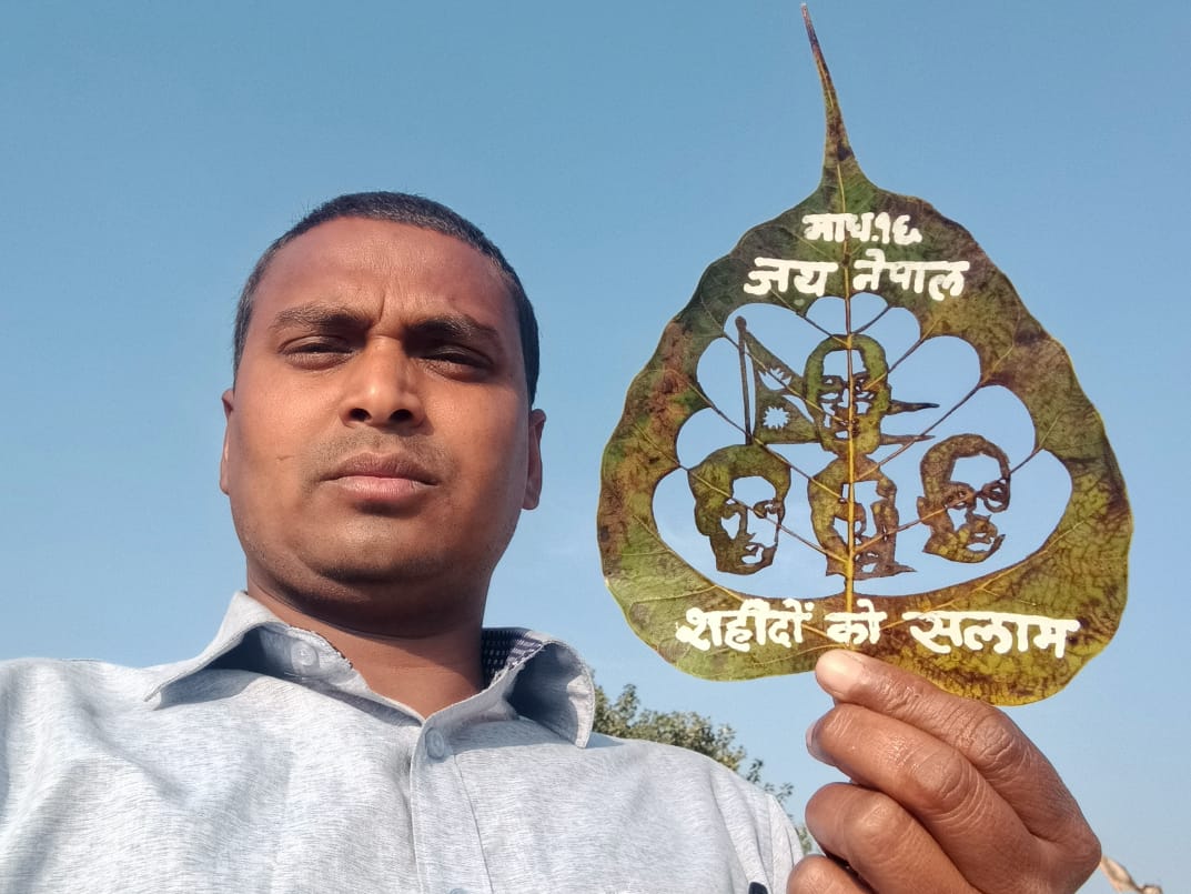 राष्ट्रिय शहीद दिवसको अवसरमा भारतका अन्तर्राष्ट्रिय ख्यातिप्राप्त लीफ आर्ट कलाकार मधुरेन्द्र कुमार ले आफ्नो विशिष्ट कलामार्फत नेपाली अमर शहीदहरूप्रति श्रद्धाञ्जली अर्पण गरेका छन्।