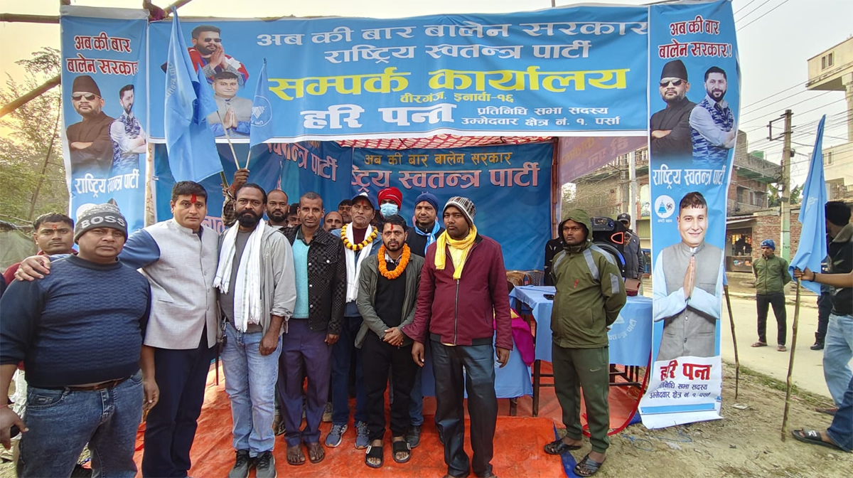 वीरगंज ६ फागुन । राष्ट्रिय स्वतन्त्र पार्टी पर्सा सभापति एवं पर्सा क्षेत्र नं. १ का उम्मेदवार हरि पन्तले बुधवार इनर्वामा राष्ट्रिय स्वतन्त्र पार्टीको सम्पर्क कार्यालयको उदघाटन गरेका छन ।