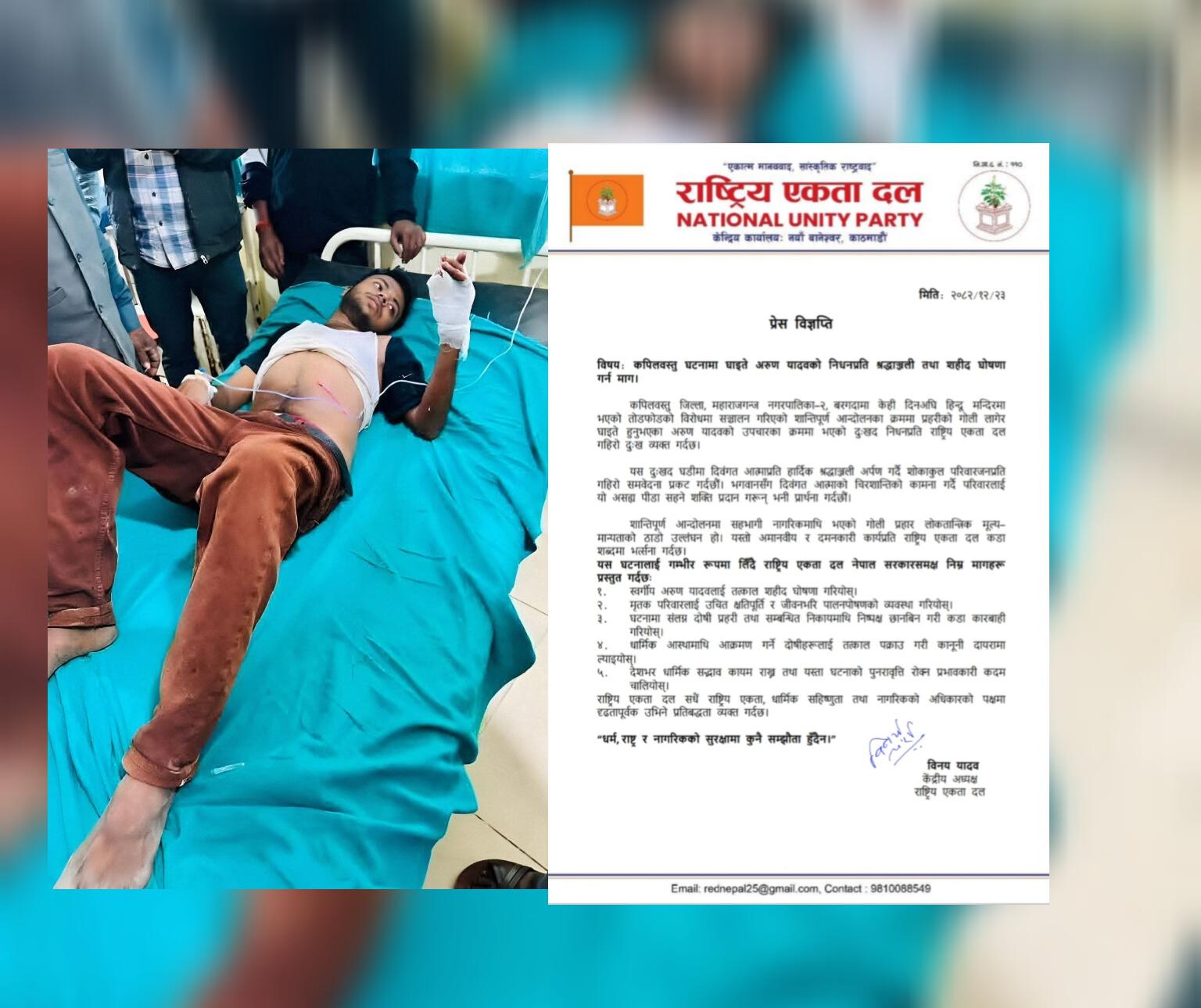 कपिलवस्तु घटनामा घाइते अरुण यादवको निधन, शहीद घोषणा गर्न राष्ट्रिय एकता दलको माग