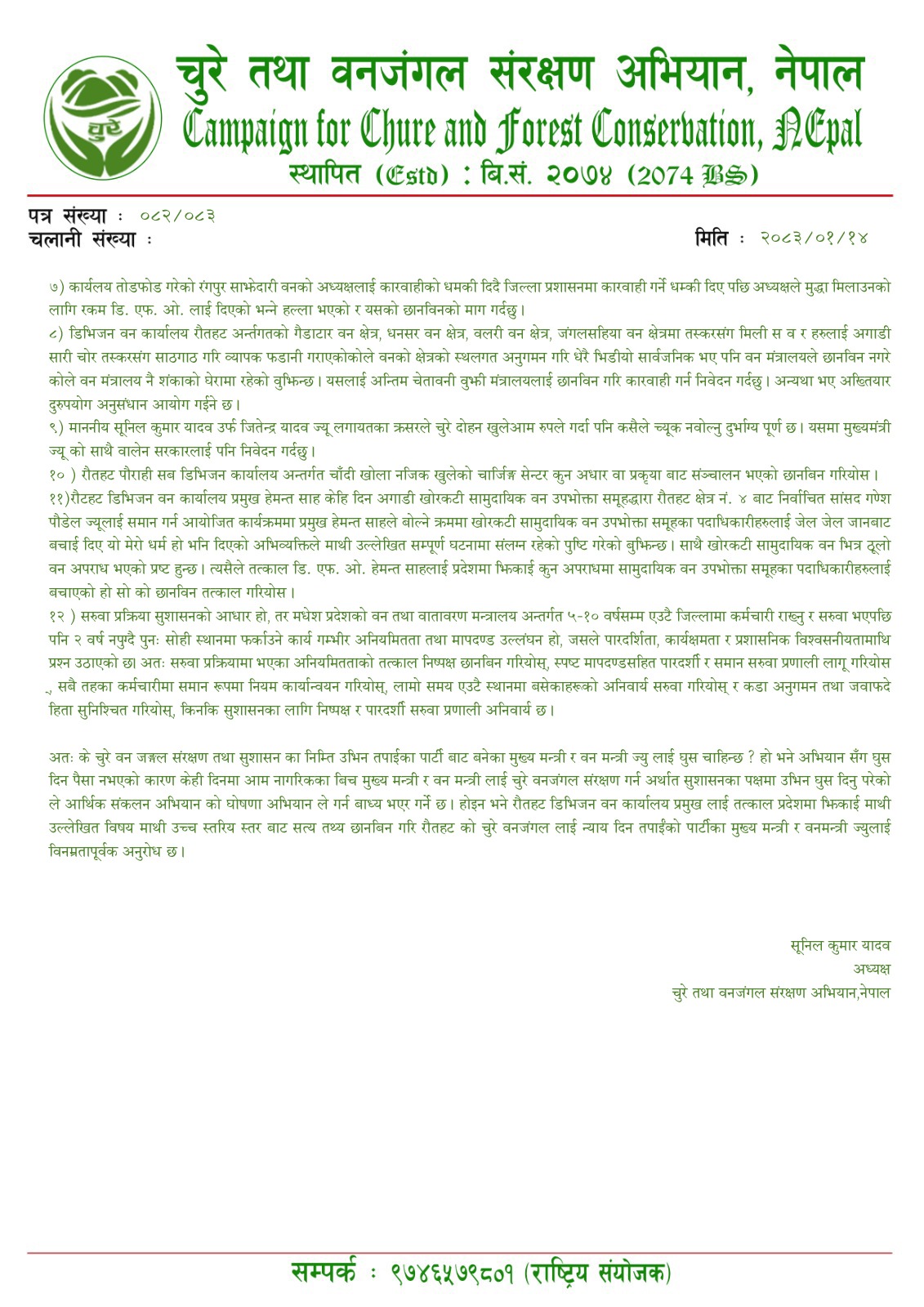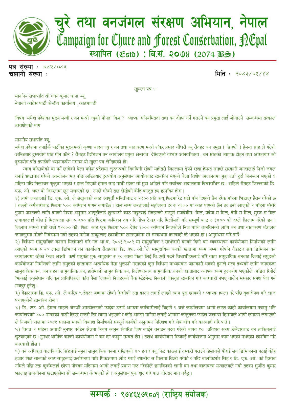 चुरे आ वनजंगल संरक्षण अभियान, मधेस रौतहट डिभिजन वन कार्यालय में होत कथित अनियमितता पर मधेस प्रदेश के मुख्यमन्त्री आ वनमन्त्री के चुप्पी के विरोध करत नेपाली कांग्रेस के सभापति गगन थापा के खुल्ला चिट्ठी लिखले बा।